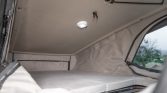 The cabin features seating surfaces trimmed in gray cloth, textured hard-plastic floors, and side-folding and removable rear seats. Additional equipment includes air conditioning, cruise control, electric windows, a removable glass sunroof panel, a Raingler cargo net, a digital rear view mirror, color-changing footwell lights, and an aftermarket Kenwood touchscreen head unit.