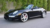 This 2008 Porsche 911 Carrera S is finished in black over a Black and Stone Gray leather interior and is powered by a 3.8-liter flat-six paired with a six-speed manual transaxle. Additional equipment includes the Sport Chrono Package Plus, a black convertible top, a speed-activated rear spoiler, automatic climate control, a Bose audio system, a Porsche navigation system, stainless-steel exhaust pipes, heated and power-adjustable seats, and 19″ alloy wheels.