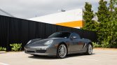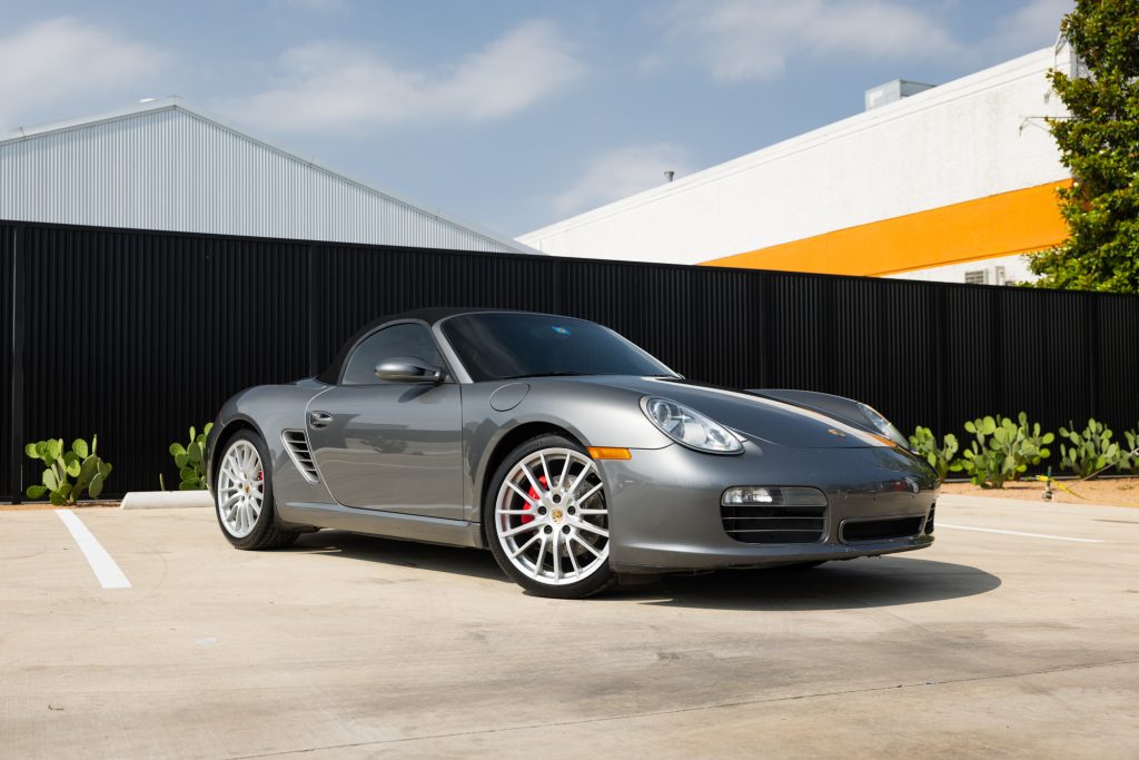 This 2008 Porsche Boxster S was the recipient of a replacement 3.4-liter flat-six in 2024 and a replacement six-speed manual transaxle in 2019. It is finished in Meteor Grey Metallic over black leather and is equipped with the Bose High-End Sound Package, hardback sport seats, a black soft top, 19″ SportDesign wheels, and a deployable rear spoiler.