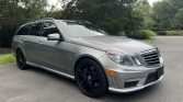 This 2012 Mercedes-Benz E63 AMG wagon is finished in Designo Alanite Gray Magno over black leather and is powered by a twin-turbocharged 5.5-liter M157 V8 linked to a seven-speed MCT automatic transmission. Equipment includes a panoramic sunroof, black 19″ AMG wheels, a back-up camera, heated and ventilated power front seats, dual-zone automatic climate control, and COMAND with navigation.