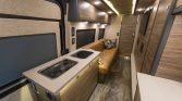 The rear cabin features a raised and coffered ceiling, engineered Dekton porcelain flooring, and fabricated storage cabinets. Appointments include a Dometic refrigerator, two-burner cooktop, and sink along with a swiveling video monitor, a Contoure microwave, a Dish Network receiver, a DVD player, a Marantz audio-visual receiver, an accessory cabin heater, automatic window blinds, and manually-sliding ceiling panels for the skylights. Control modules for the solar, air conditioning, generator, water tanks, and battery systems are housed in a cabinet, and cabin controls are adjusted via tablet or wall-mounted switch panels.