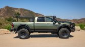 This 2022 Ram 2500 Power Wagon has been fitted with the American Expedition Vehicles (AEV) Prospector XL package, and it is powered by a 6.4-liter Hemi V8 linked with an eight-speed automatic transmission, a dual-range transfer case, and Tru-Lok front and rear differentials with revised gearing. The truck is finished in Olive Green Pearl-Coat and has a lifted suspension, Bilstein shocks, 17″ wheels, and 40″ tires along with heavy-duty bumpers, high-clearance fender flares, an air intake snorkel, a front brush guard, a bed rack, LED auxiliary lights, and a WARN winch. Other features include a surround-view camera system, Harman Kardon audio, Uconnect infotainment, and heated and ventilated front seats trimmed in black leather.
